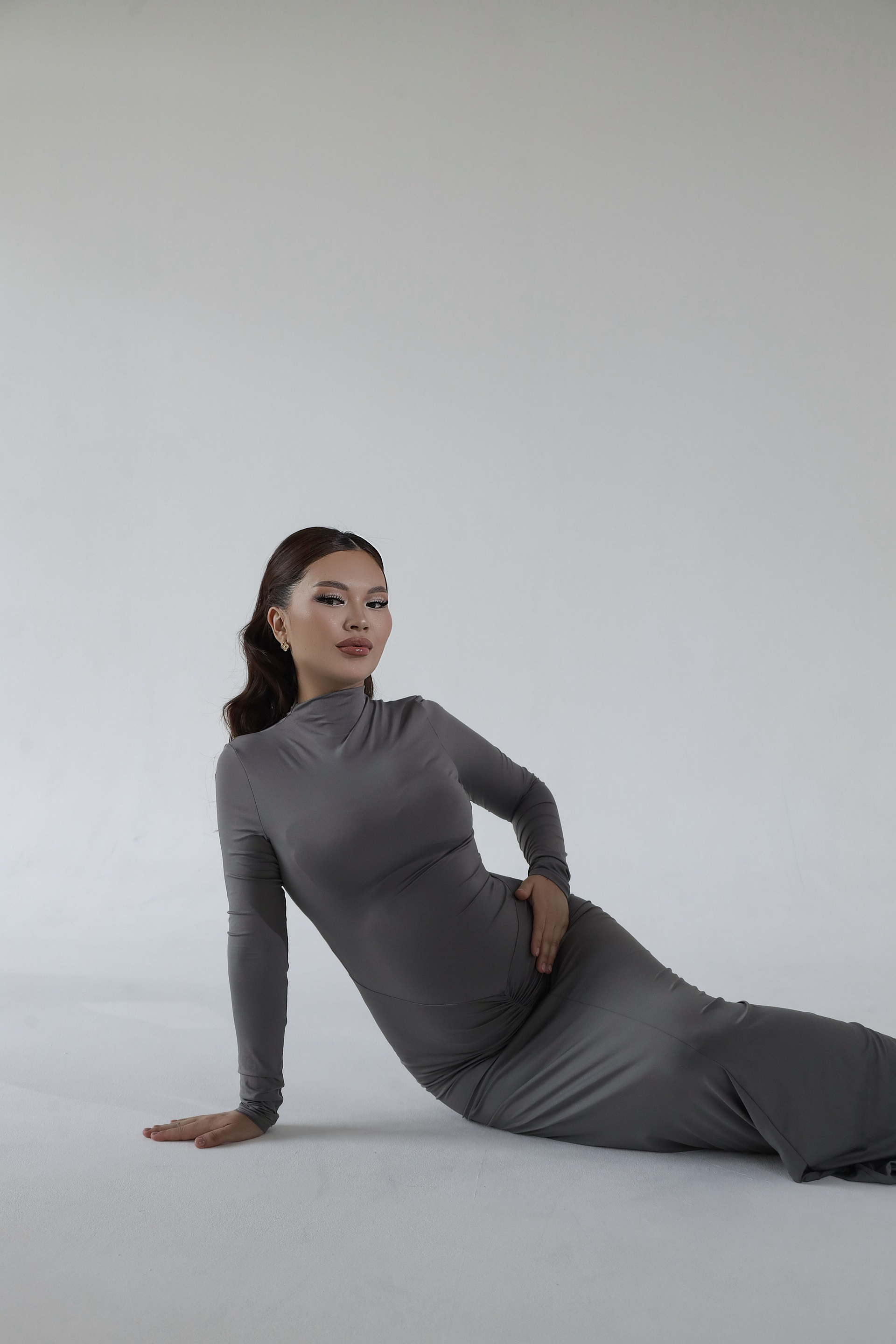 утонченное платье в дорогом сером цвете,подойдет на размеры S\M\L. Так же подойдет для покрытых, платье без вырезов